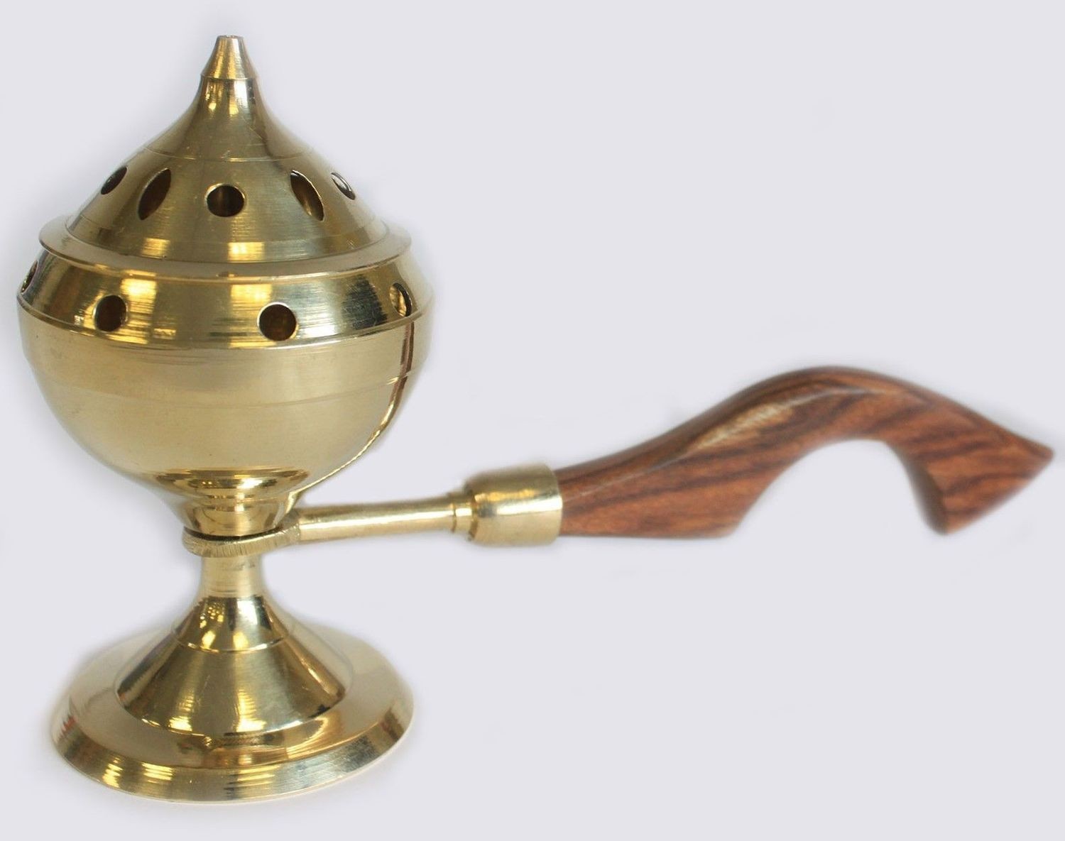 Brûle encens en laiton avec manche en bois, mesure environ 11,5 cm de hauteur, pour un poids de environ 220 gr. Possède un couvercle percé pour une diffusion large. Permet de brûler en toute sécurité les différentes variétés d'encens : grains, poudre, bâtonnets, cônes, charbons, cubes'Diamètre : 6,5 cm